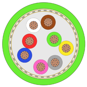 | Colour cores: white-grey – violet-blue – yellow-green – orange-red – brown-black – white/green-white/yellow – white/orange-white/red – white/brown-white/black | Pairs: sixteen cores stranded in eight cores Total: eight pairs stranded together around a central filler | |