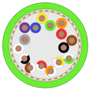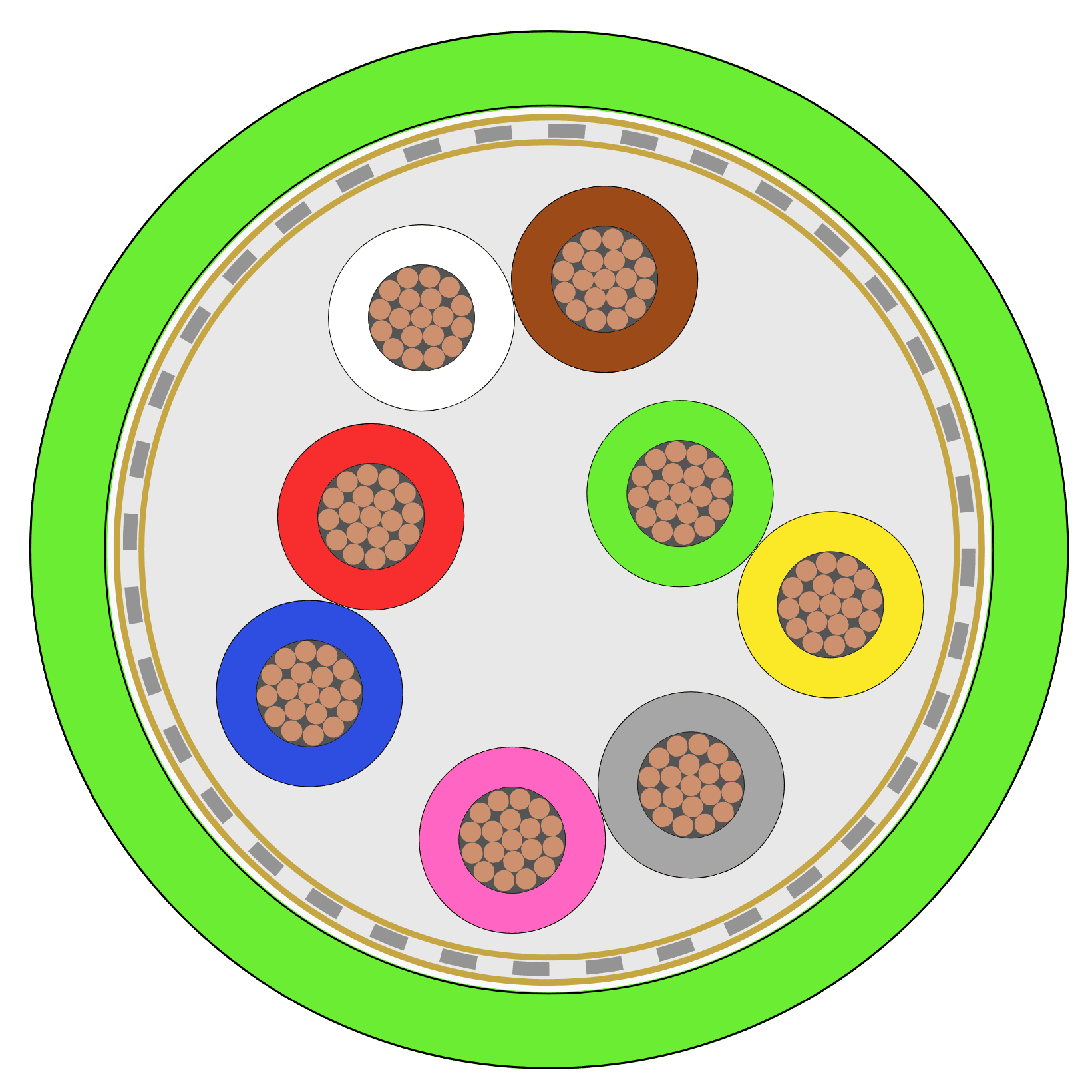 Colour cores acc. to DIN 47100Pairs: eight cores twisted in four pairs; colour pairs: white-brown – green-yellow – gray-pink – blue-red