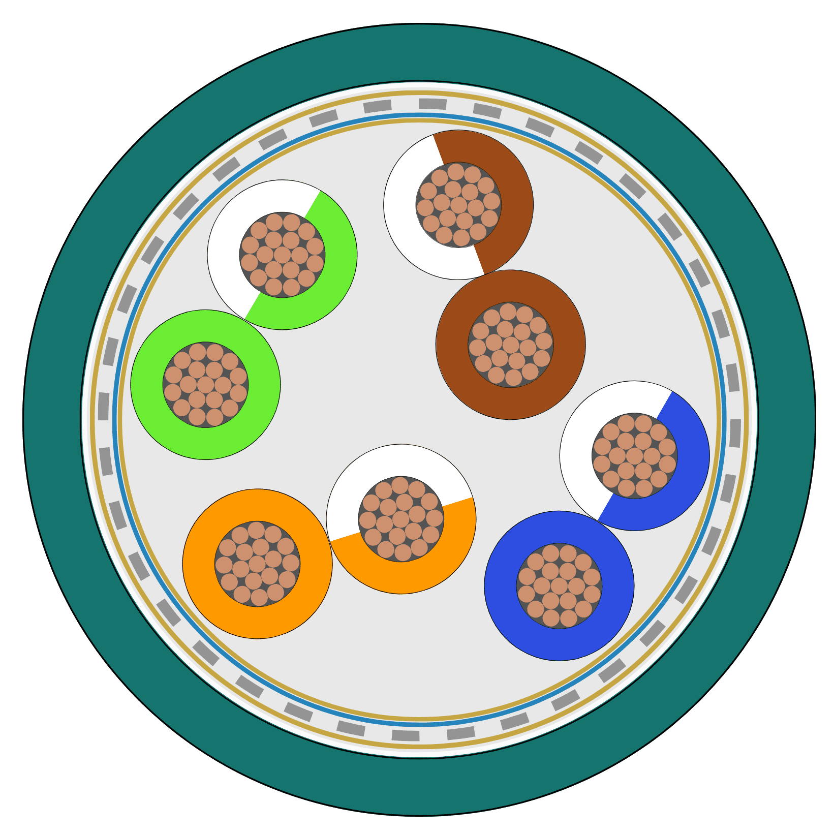 Colour cores: orange/white polarized orange – green/white polarized green – brown/white polarized brown – blue/white polarized bluePairs: cores twisted in pairs (orange/white pol. orange – green/white pol. green – brown/white pol. brown – blue/white pol. blue)