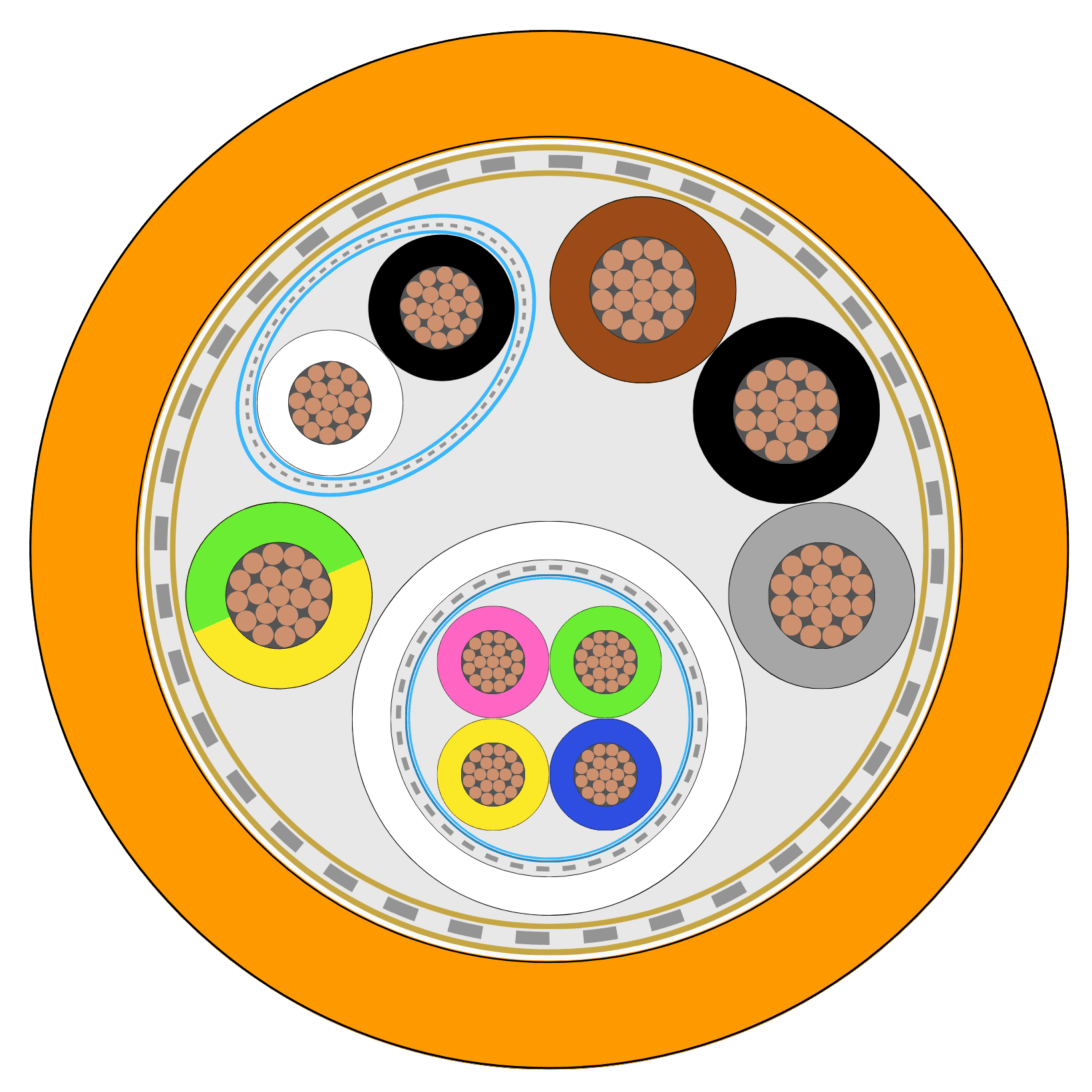 | Conductor: stranded tin copper wire (Class 6); nom. 2,50mm² – AWG14; nominal diameter 2,10mm; VDE 0295. Lay agree with UL 758 tab 5,9; conform to EN 13602 – ETP1, DIN 40500 E-Cu 58 ⇂ Insulation: polyolefin compound; nominal diameter 3,1mm ⇂ Core Identification: brown printed (U/L1/C/L+) – black printed (V/L2) – grey printed (W/L3/D/L-) – green/yellow | 1x(4xAWG26)C + 1x(2xAWG16)C + 4xAWG14 stranded together around a central filler; some fillers could be used for a better roundness | |