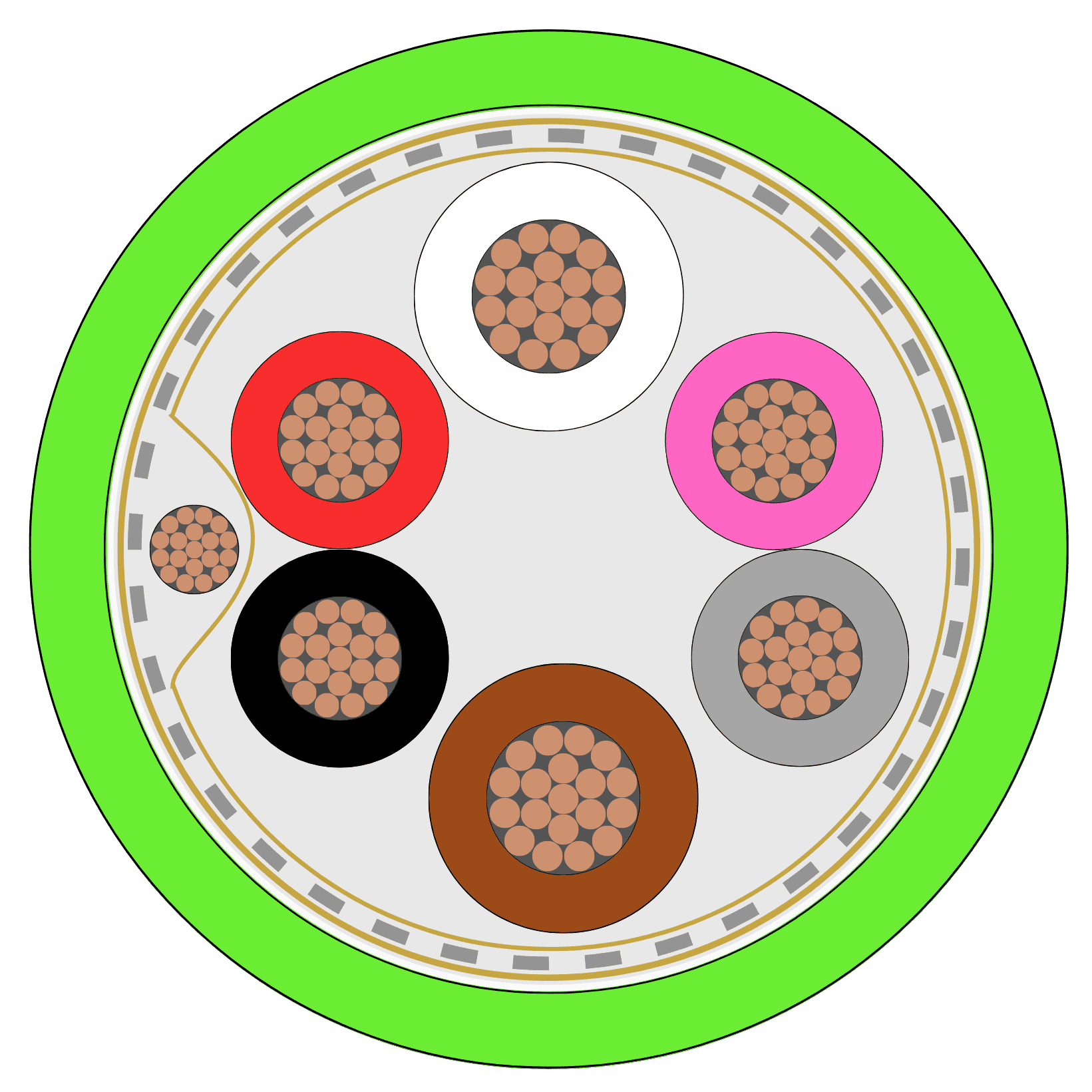 Conductor: stranded bare copper wire (Class 6); nom. 0,25mm² – AWG24; nominal diameter 0,62mm; VDE 0295. Lay agree with UL 758 tab 5,9; conform to EN 13602 – ETP1, DIN 40500 E-Cu 58